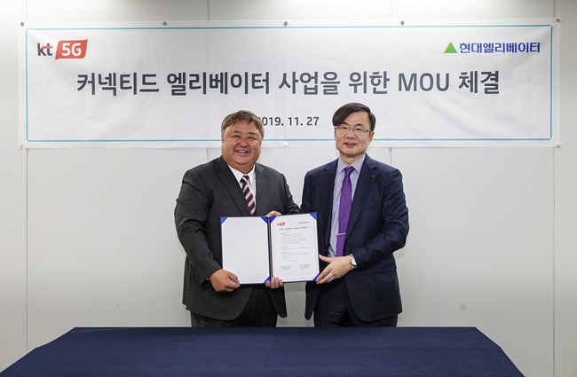 현대엘리베이터(대표이사 송승봉)와 KT(회장 황창규)가 27일 현대그룹빌딩(서울시 종로구)에서 ‘커넥티드 엘리베이터 사업을 위한 양해각서(MOU)’를 체결하고 ICT(Information & Communication Technology)를 접목한 차세대 엘리베이터 개발에 함께 나선다고 밝혔다.