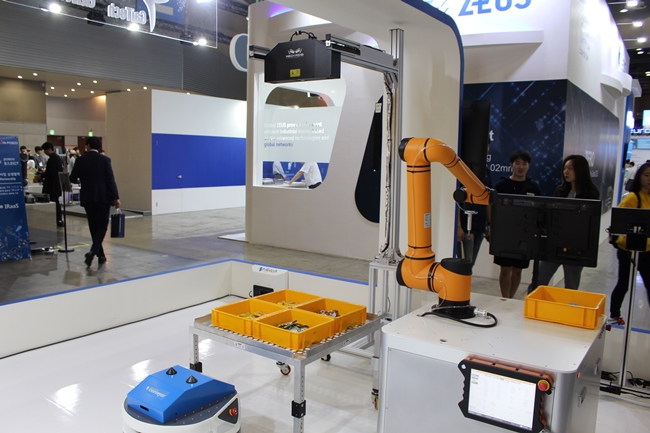 가이텍코리아가 선보인 오더피킹시스템. MECHMIND 3D비전이 협동로봇을 제어해 빈피킹을 실시한다(사진. 로봇기술).