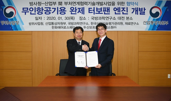 산업통상자원부(이하 산업부)와 방위사업청은 지난 1월 30일(목) 미래 국방 무인기용 고성능 터보팬 엔진의 성공적인 개발을 위해, 부처 협의체 구성 등의 내용을 포함한 업무협약(MoU)을 체결했다.