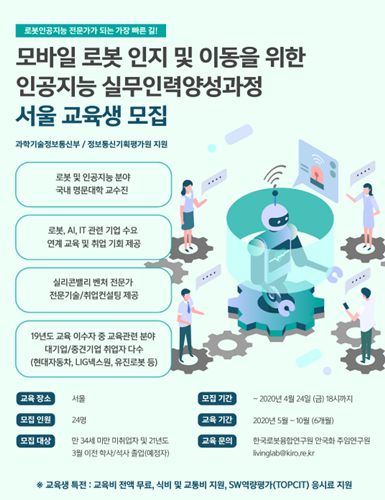 한국로봇융합연구원(이하 KIRO)이 로봇분야 인재 양성을 위해 ‘모바일로봇 인지 및 이동을 위한 인공지능 실무인력 양성과정’ 교육생을 모집한다.