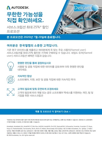 한국델켐(주)(이하 델켐)이 오는 7월 23일(목)까지 기존 델켐 또는 오토데스크의 영구 라이선스를 반납하고, 신규 서브스크립션 라이선스를 구매하는 고객에게 최대 25%의 할인 혜택을 제공할 계획이다.