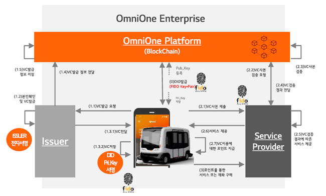 FIDO 생체인증과 DID 기술이 적용된 ‘옴니원’은 자율주행 서비스가 시작되는 지점인 이용자와 자율주행 차량에 대한 인증을 제공한다. 중앙 서버나 관제 센터를 통한 단일 인증이 아닌 자율주행 구성 요소들간의 통신 시 상호 인증 방식을 통해 각 노드 및 구성간 통신에 대한 해킹 위협을 방지함으로써 장애 없는 안정적인 서비스 운영이 가능하다. 또 인증서 발급에 따른 제반 비용도 절감된다.