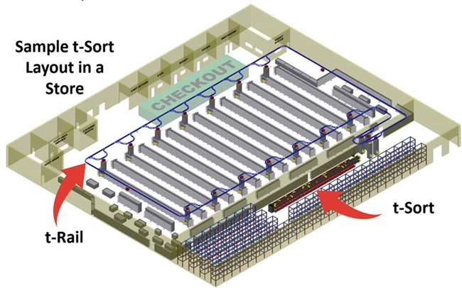 아울러 t-Sort는 새로운 t-Rail 시스템과 함께 작동해 매장과의 제품 오버 헤드 운송을 제공하고, 매장 혼잡 및 인간 상호 작용을 최소화해 점진적 ROI 및 고객에게 부가가치를 제공할 수도 있다.