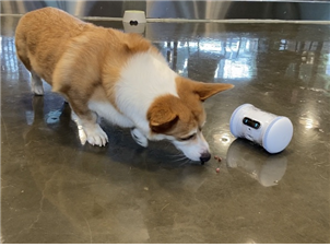 인공지능 로봇이 제공하는 간식을 먹는 강아지 (사진. 강동구)