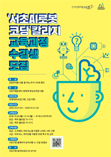 서울 서초구가 4차 산업시대의 인재 수요에 발맞추고, 평소 개인이 접하기 어려운 로봇을 직접 실물로 다루며 학습할 수 있도록 서울시 자치구 최초로 ‘서초 AI로봇코딩 칼리지’를 개설해 오는 26일부터 12월 14일까지 운영한다고 밝혔다.