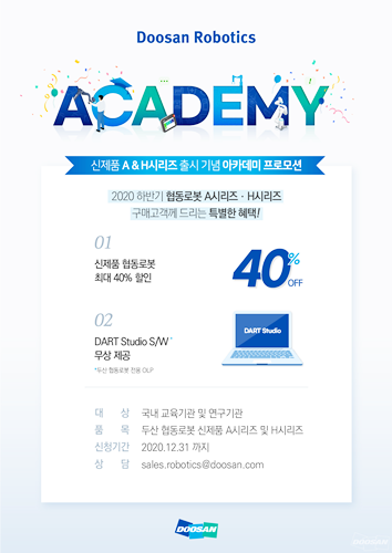 두산로보틱스가 신제품 A&H시리즈 출시 기념 아카데미 프로모션을 진행한다. 두산로보틱스는 2020년 하반기 협동로봇 A&H시리즈를 구매하는 고객들을 대상으로 신제품 협동로봇을 최대 40% 할인하는 한편, DART Studio S/W(두산 협동로봇 전용 OLP)를 무상으로 제공한다고 밝혔다.