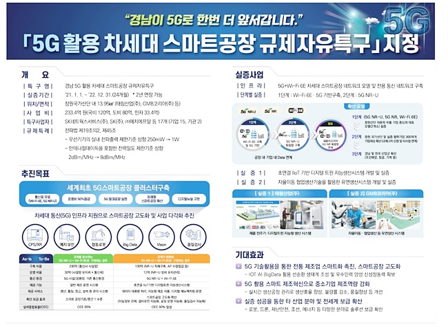 ‘경남 5G활용 차세대 스마트공장 규제자유특구’는 2021년부터 2022년 말까지 2년간 창원국가산단 태림산업과 GMB코리아 두 회사를 대상으로 5G 활용 공장 실증에 들어간다.