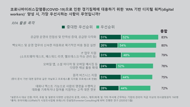 설문조사에 참여한 83%의 경영진에 따르면, 자동화 및 AI 기술이 미래 직업의 필수 역량으로 자리매김할 것이다. 82%의 경영진은 팬데믹 사태 속 재택근무 의무제도 확산으로 인해 현재 직원 및 미래에 채용할 직원이 AI 및 자동화 활용 실무 지식을 갖춰야 할 필요성이 높아지고 있다는 데 동의했다.