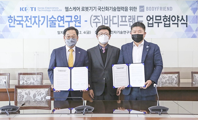 한국전자기술연구원(KETI)이 12월 4일(금) ㈜바디프랜드와 헬스케어로봇기기 기술 국산화 및 국내 제조 생태계 구축을 위한 업무협약을 체결했다고 밝혔다.