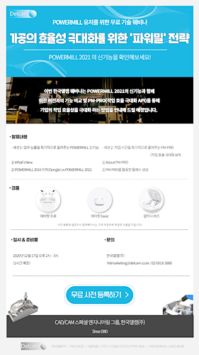 CAD/CAM 스페셜 엔지니어링 그룹 한국델켐(주)(이하 델켐)이 파워밀(POWERMILL) 유저를 위한 무료 기술 웨비나를 진행한다고 밝혔다. 델켐은 이번 웨비나를 통해 파워밀 2021의 신기능을 확인할 수 있도록 하는 한편, 가공 효율 극대화를 위한 파워밀 전략의 모든 것을 선보인다는 계획이다.