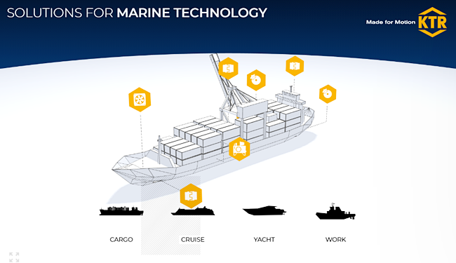 케이티알은 해양산업 분야를 선도하는 공급기업에 커플링, 전자 및 유압 브레이크, 샤프트 연결부, 냉각기 및 유압부품 등의 광범위한 포트폴리오를 제공한다. 화물, 여객 및 작업용 보트의 주드라이브 및 보조드라이브뿐만 아니라 호이스트, 크레인 시스템 및 선상 펌프에도 사용되는 이들의 제품들은 각 드라이브 시스템의 효율성과 긴 수명을 확보할 수 있도록 한다.