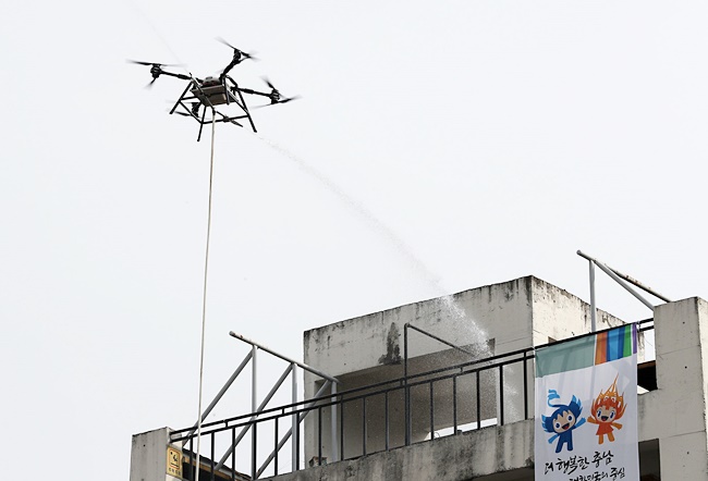 실증훈련에 투입한 소방드론은 15m 상공에서 10㎏/㎠의 압력으로 20m 안팎의 물줄기를 5분가량 내뿜었다.