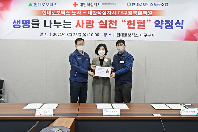현대로보틱스가 올해도 신종 코로나바이러스 감염증(코로나19) 사태로 인한 혈액 수급난 해소에 적극 나서기로 했다. 현대로보틱스 노사와 대구경북적십자혈액원은 지난 3월 25일(목) 코로나19사태 장기화로 인한 혈액수급 위기상황을 극복하고 수혈이 필요한 환자의 생명을 살리기 위한 헌혈운동에 적극 동참하기로 약속하는 ‘헌혈약정’을 본사에서 체결했다.