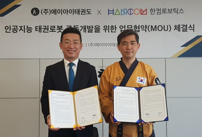 지능형 로봇 전문기업 한컴로보틱스가 벤처기업 에이아이태권도와 ’인공지능(AI) 기반 태권 로봇 개발’을 위한 업무협약(MOU)을 체결했다고 밝혔다.