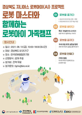 한국로봇융합연구원이 오는 8월 13일 인공지능 로봇에 관심 있는 경북도내 초·중등학생과 학부모 25팀(가구)를 대상으로 로봇마스터와 함께하는 로봇아이(AI) 가족 캠프를 개최한다고 밝혔다.