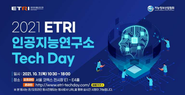 한국전자통신연구원(이하 ETRI)은 ‘2021 인공지능연구소 테크데이’를 10월 7일(목) 코엑스에서 온·오프라인으로 개최, 인공지능(AI) 관련 중점 연구개발 성과를 일반에 공개한다고 밝혔다.