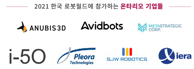 본 미팅은 캐나다 온타리오주 소재한 로봇기업과 협력을 희망하는 한국 로봇기업을 대상으로 한다. 미팅에 참석하는 캐나다 로봇기업은 ▲Anubis 3D ▲Avidbots ▲i-5O ▲META STRATEGIC CORP ▲Pleora ▲SJW Robotics ▲Xiera 총 7개 社다.