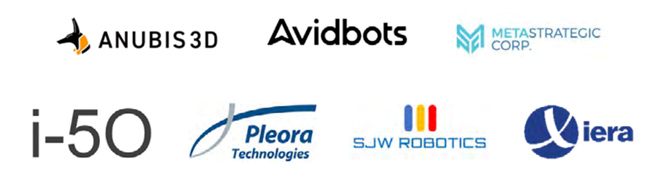 로봇 7개사는 ▲팔레트 작업용 서피스 그리퍼(Surface Gripper), 포장 산업용 자동화 픽-앤드-플레이스 보틀 그리퍼(Automated Pick and Place Bottle Gripper) 및 자동화 카튼 이렉터(Automated Carton Erector), AGV용 팔레트를 운반하는 경량 자동화 부품을 설계 및 제작하는 Anubis 3D ▲자율 커넥티드 로봇을 설계, 제조, 판매 및 지원하는 Avidbots ▲AI 자동식 컴퓨터 시각을 사용해 수동식 생산 공정을 평가하고 개선하는 솔루션을 제공하는 i-5O ▲표준 자동화 소프트웨어 기반 시스템 & 공정, AI & ML 지원 솔루션 등의 종합 비즈니스 서비스를 제공하는 Meta Strategic ▲첨단 머신 러닝 기반으로 공정 자동화 플랫폼을 개발하며 품질 관리 효율을 제고하는 Pleora ▲완전 자율형 로봇 퀵서비스 식당을 개발한 SJW Robotics ▲고도의 비선형 노이지 시스템으로 다중 입력/출력 퍼지 논리 제어기인 자동 튜너를 개발한 Xiera 등이다.