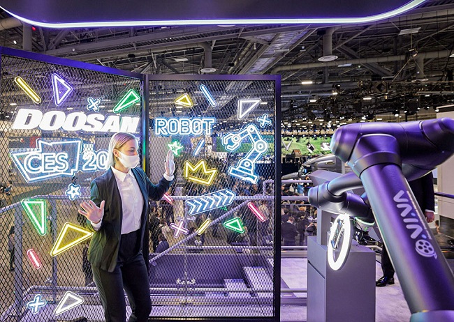 로봇 비즈니스에 공격적으로 드라이브를 걸고 있는 두산 또한 CES 2022에서 로봇 기반의 볼거리를 제공했다. 오프라인 기준으로 이전 CES 2020에서 협동로봇을 통한 산업용 로봇 사업에 포커스를 뒀다면, 올해에는 ‘유쾌한 일상(Delightful Life)’을 테마로 로봇기술을 통한 생활의 변화를 보여주는 데 초점을 맞췄다.