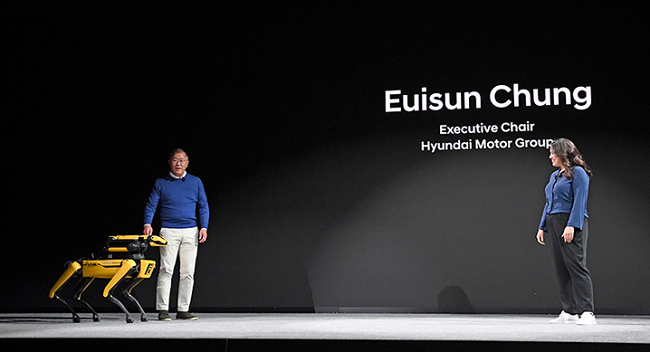 현대차그룹 정의선 회장이 스폿과 함께 기조발표에 나섰다. (사진. 현대차그룹)