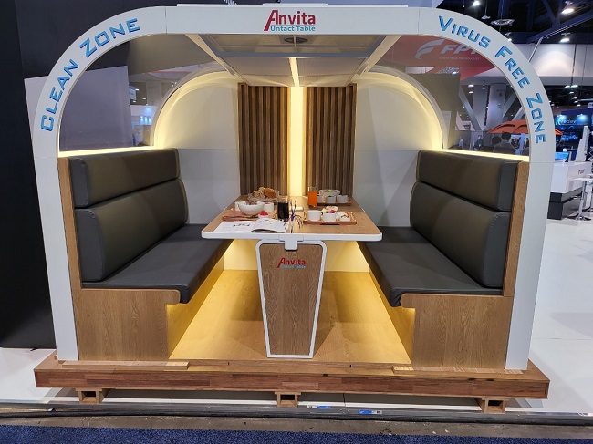 식사 중 마스크를 벗는 상황에서도 비말을 차단하는 언택트 테이블(사진. 비전세미콘)