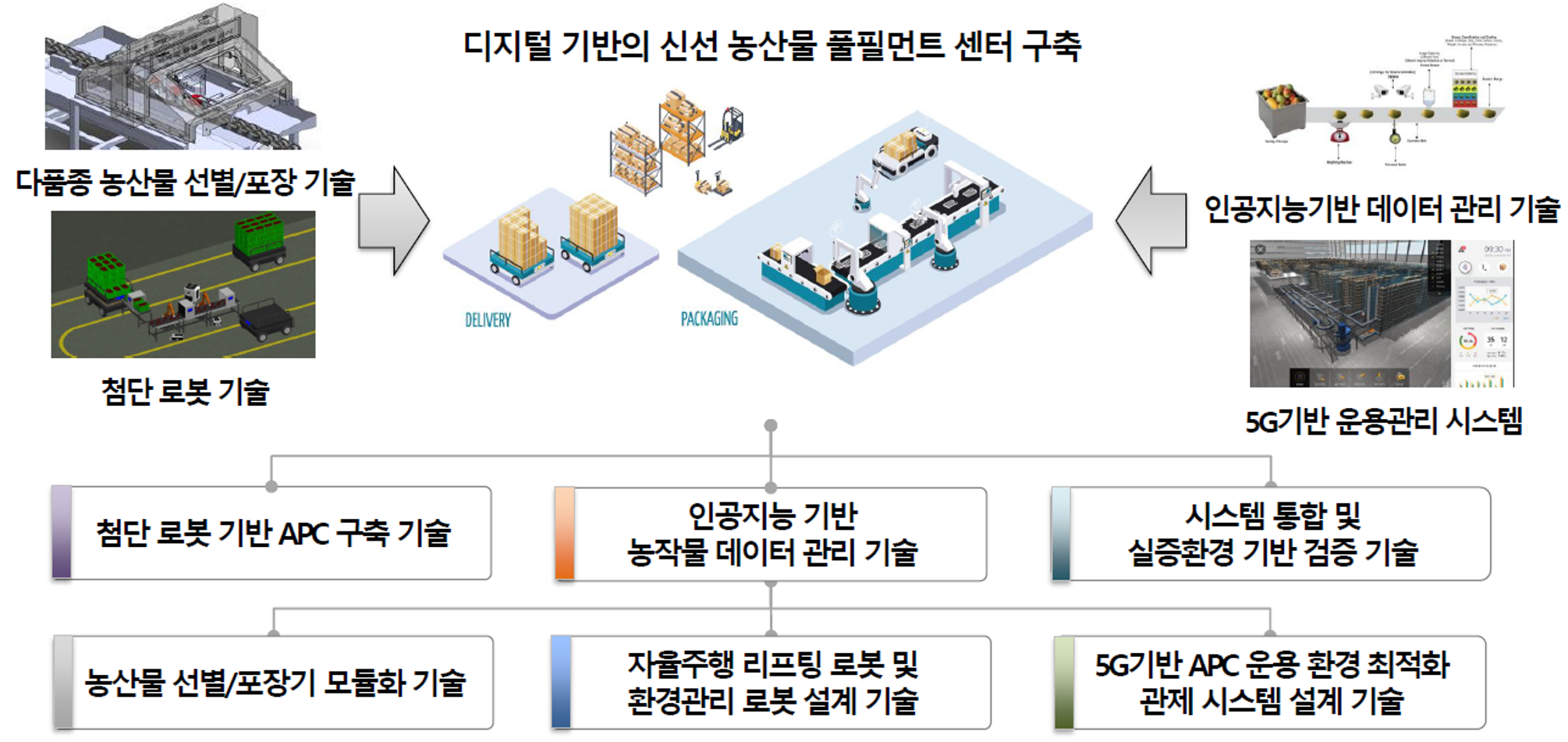 스마트 농산물 유통저장 기술개발 사업은 신선농산물 유통·소비 혁신을 위한 데이터 기반의 저장·수급 관리기술 개발 및 첨단 로봇 적용 선별, 이송, 적재 등 물류의 모든 단계에서 자동화를 구현하는 사업이다. 전체 사업기간 5년 동안 국비 총 228 억을 투자해 과실류와 노지채소 주산지인 경북 안동과 전남 무안 두 곳에 산지유통센터 (APC) 실증단지를 구축하고 현장 실증을 추진하게 된다.