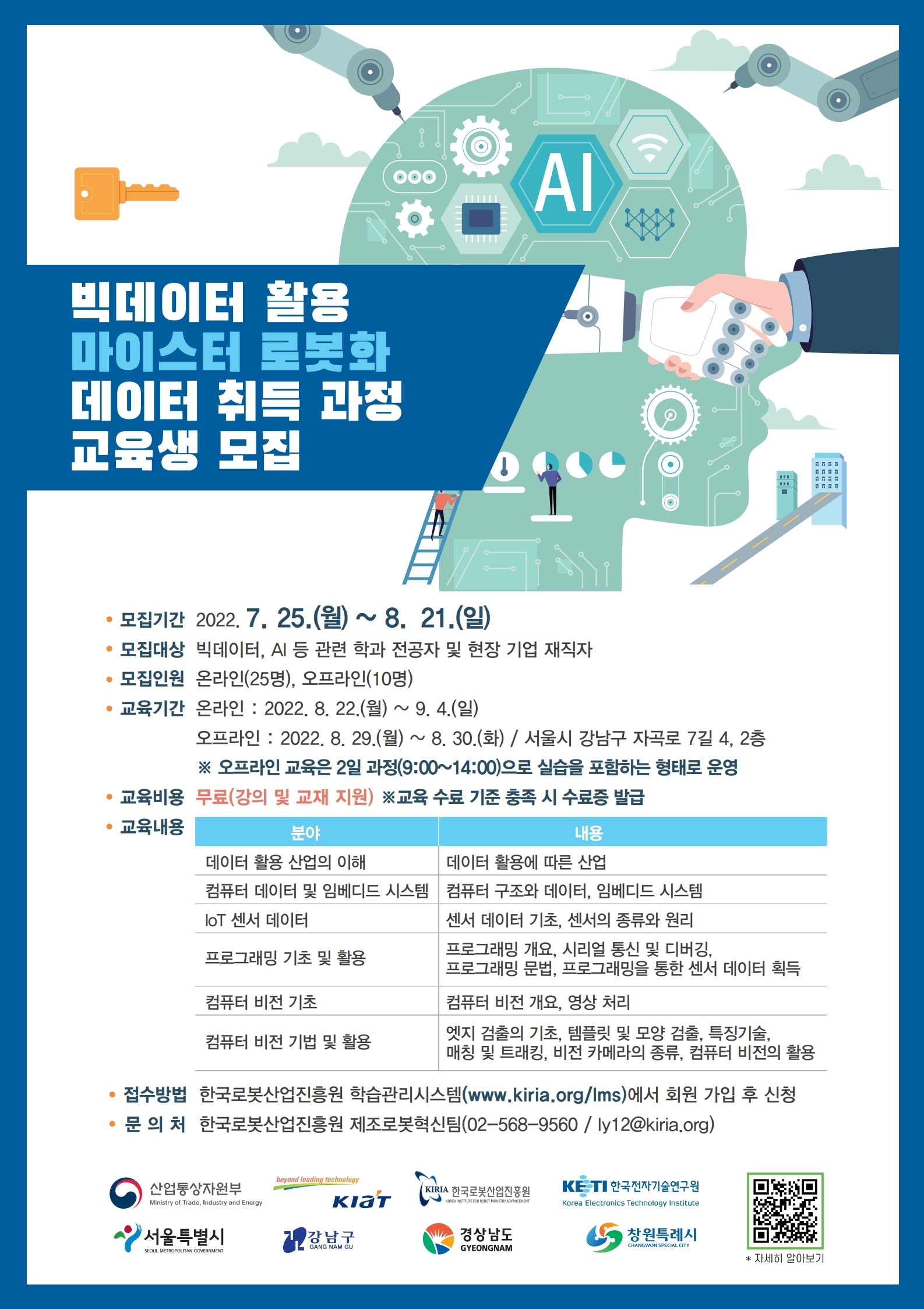 한국로봇산업진흥원(이하 진흥원)이 빅데이터 활용 마이스터 로봇화 데이터 취득 과정을 개설해 온‧오프라인 교육생 총 35명을 모집한다고 밝혔다.