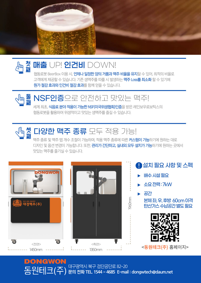 한편, 동원테크의 BB BEER BOX 로봇은 2022 서울 바 & 스피릿쇼 전시회 기간 중 서울 코엑스 3층 D홀 E9번 부스에서 직접 만나볼 수 있다.