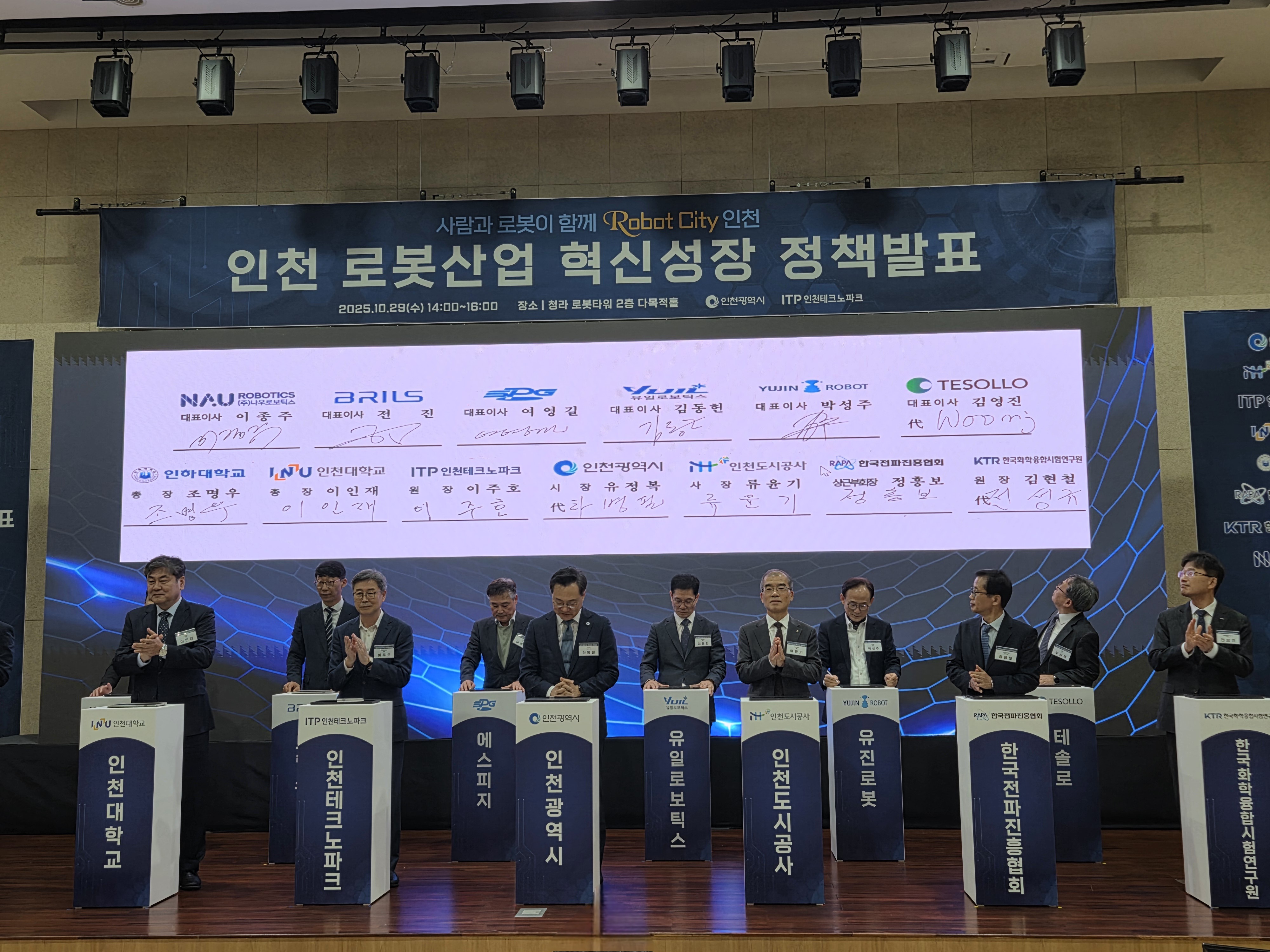 인천광역시가 10월 29일(수) 청라 로봇타워에서 ‘인천 로봇산업 혁신성장 정책발표회’를 열고, 유일로보틱스를 비롯한 13개 산·학·연·관 기관과 ‘인천 로봇산업 육성 및 발전을 위한 상호협력 협약(MOU)’을 체결했다고 밝혔다.