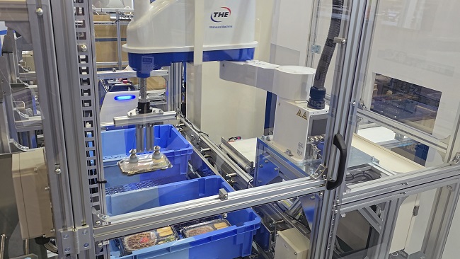 스카라 로봇 분야에서 강세를 보이는 시바우라머신은 모듈화된 스카라 로봇 도시락 건입 자동화 라인을 소개했다. 시바우라머신의 스카라 로봇이 토트박스에 포장된 도시락을 차곡차곡 담는 이 자동화 시스템은 실제 고객사 현장 적용된 제품으로, 가격 경쟁력을 확보하기 위해 스카라 로봇을 포함한 전체 시스템을 모듈로 통합 개발한 것이 특징이다.