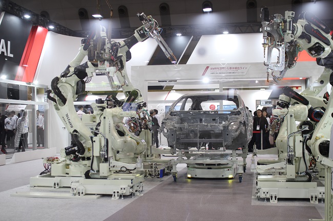 가와사키중공업은 메인 전시 존에 실제 자동차 스폿 용접 라인을 데모로 꾸려 참관객들의 눈길을 사로잡았다. 해당 데모는 가와사키중공업이 고객사의 요청으로 개발한 기술로, 차체 이송에 셔틀 대신 AMR을 적용한 것이 특징이다.