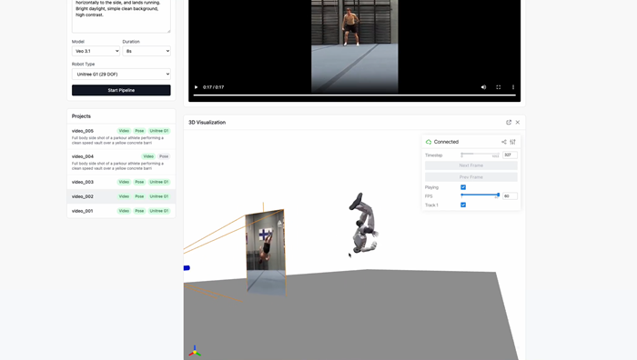 이번에 선보인 오픈소스 파이프라인 ‘Video2Robot’은 영상 속 인간의 동작을 로봇 학습 데이터로 변환하는 엔진으로 ▲인간과 근접 상호작용 ▲급경사 미끄러짐 ▲고하중 물체 조작 시의 균형 붕괴 등 현실에서 직접 연출하기 어려운 시나리오를 생성형 AI를 활용해 로봇 모션 데이터로 안전하게 변환한다.