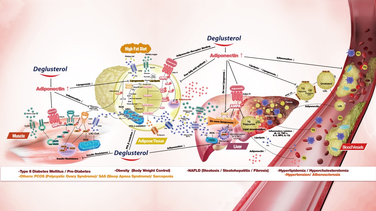 디글루스테롤은 인슐린 감수성 개선과 혈당 조절에 도움을 주는 건강기능식품 원료로, 2022년 미국 FDA 신규 건강기능식품 원료(NDI)로 등재된 바 있으며, 이후 당뇨·비만·지방간 등 대사 이상 관련 연구에서 긍정적인 효과가 확인돼 왔다.