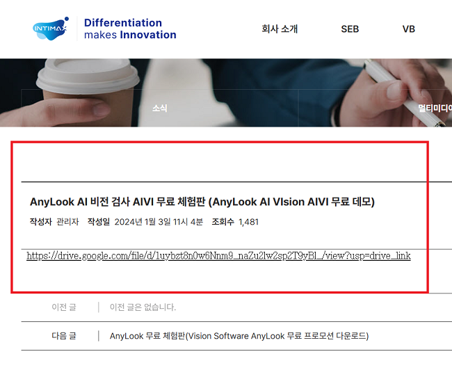 인티맥스 홈페이지에서 AI 비전 소프트웨어 무료 체험판을 다운로드할 수 있다. / 사진. 인티맥스 홈페이지 갈무리