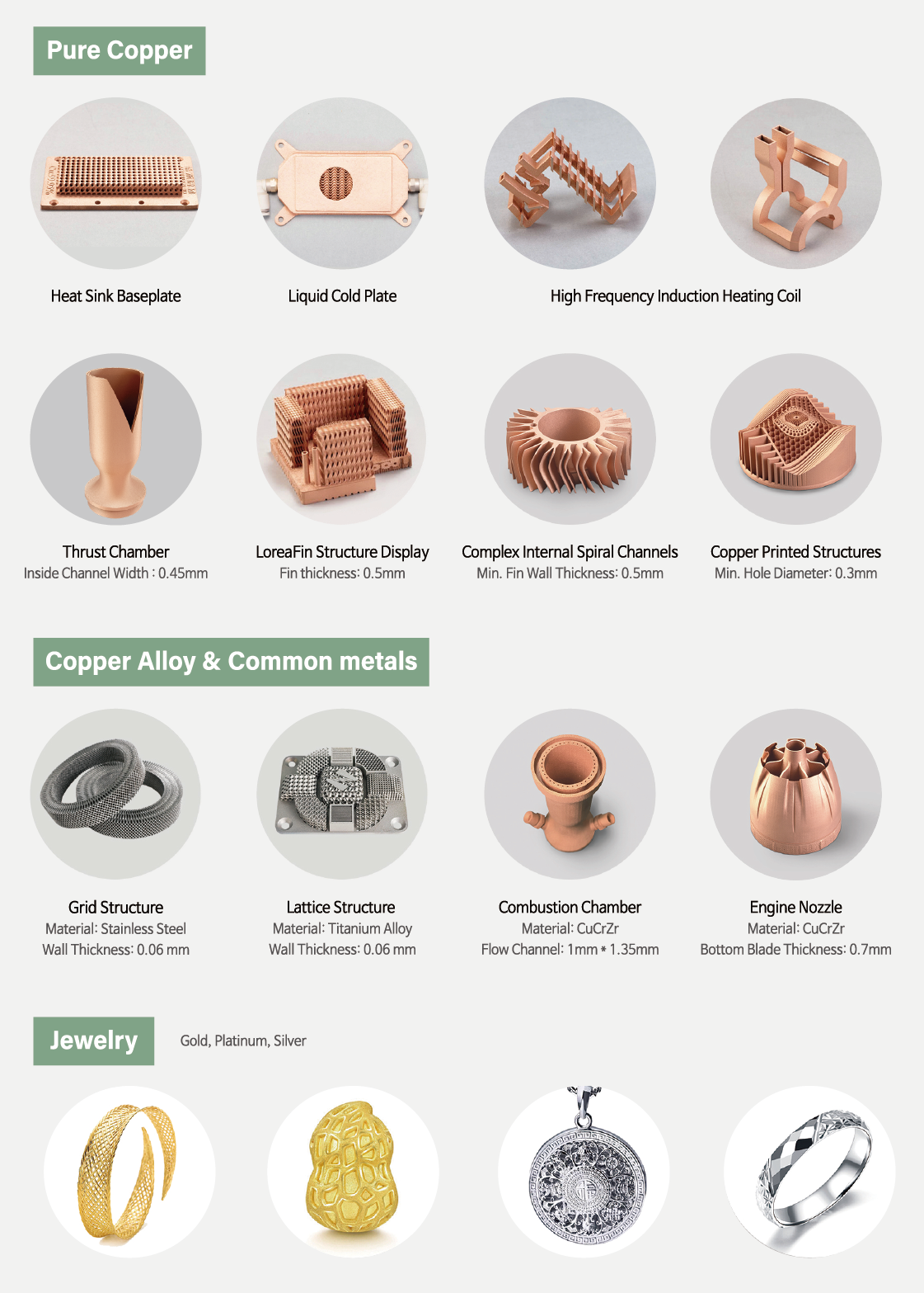 532nm 파장을 가진 업계 최초의 산업용 그린 레이저 중 하나로, 고굴절 금속 분말 가공에 적합하며, 적외선 파장으로는 가공이 어렵거나 불가능한 구리, 구리 합금 및 기타 귀금속과 같은 소재의 3D 프린팅을 지원한다.