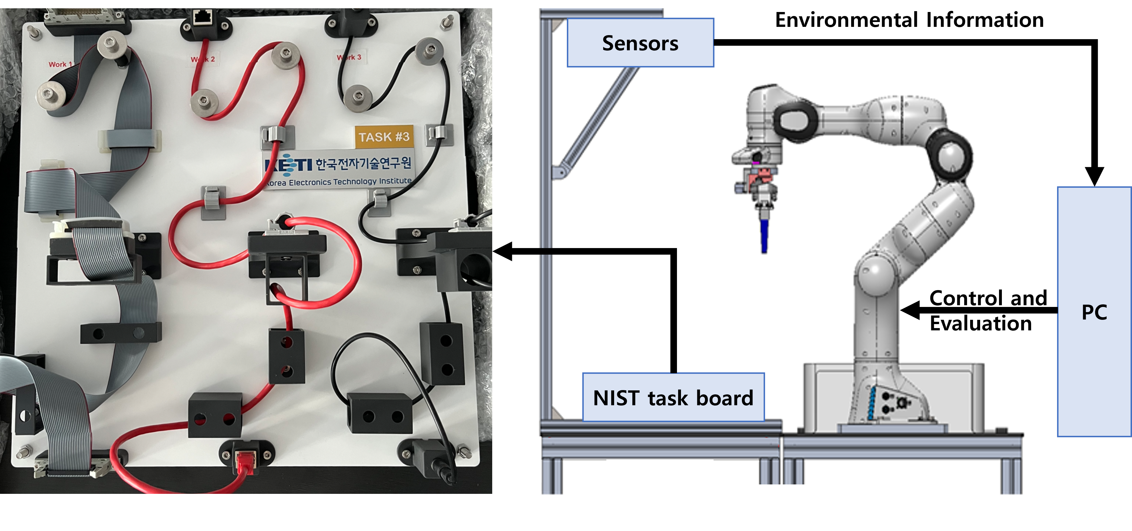 단체 표준 제정을 추진 중인 표준인 ‘로봇 시스템의 와이어하네스 조작 성능평가 방법’은 리테이너와 커넥터와 구성된 태스크 보드 상에서 와이어하네스를 지정된 경로에 따라 삽입 및 결속하여 로봇의 유연체조작 성능을 평가한다. 기존의 강성체만 다루던 제조용 로봇 시스템의 활용 범위가 다루기 까다로운 대상물의 조작까지 확대되는 시장 상황을 고려하여 개발 중이다.